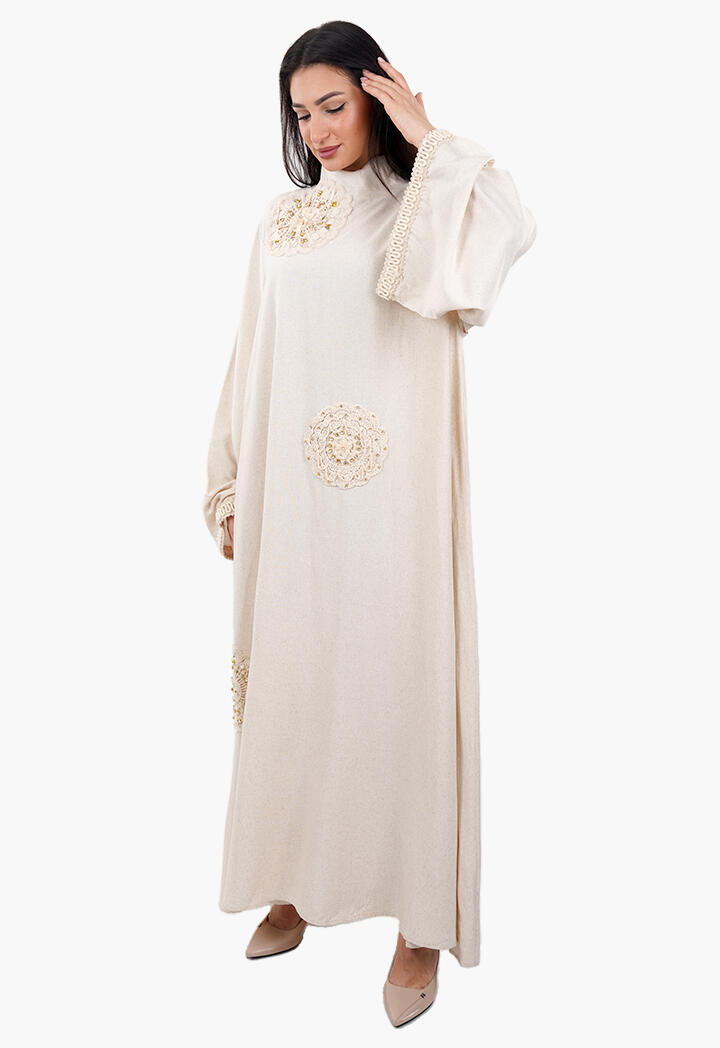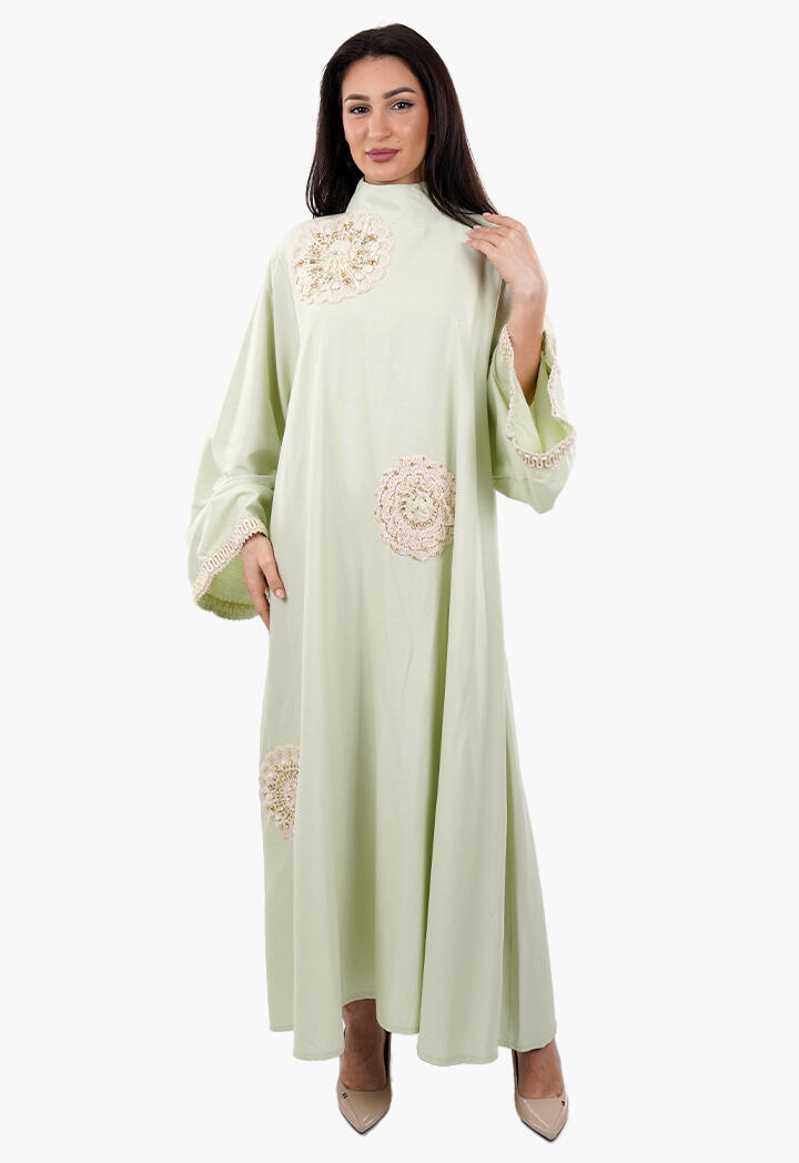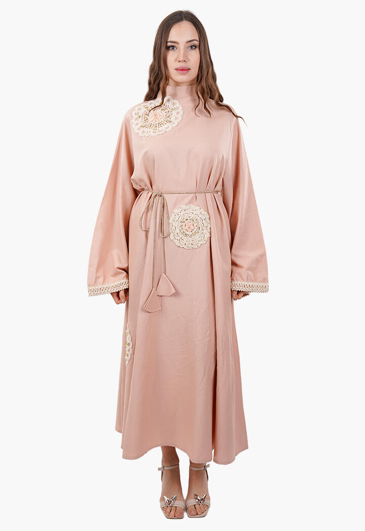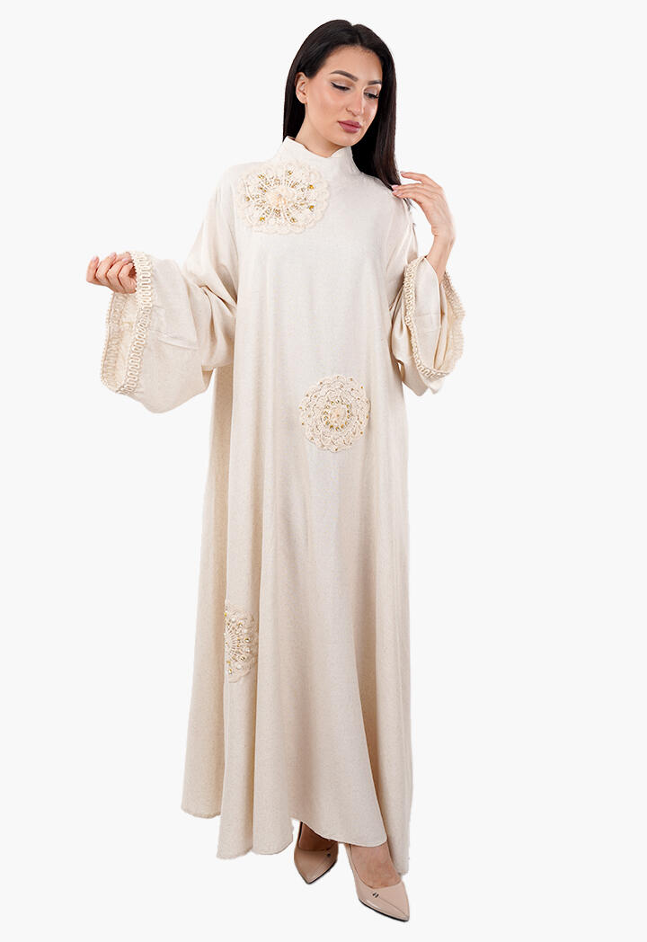 بيرتي فاشون نافذتك لأحدث صيحات الموضة | فستان طويل فضفاض مطرّز بأشكال ورود مع ياقة عالية