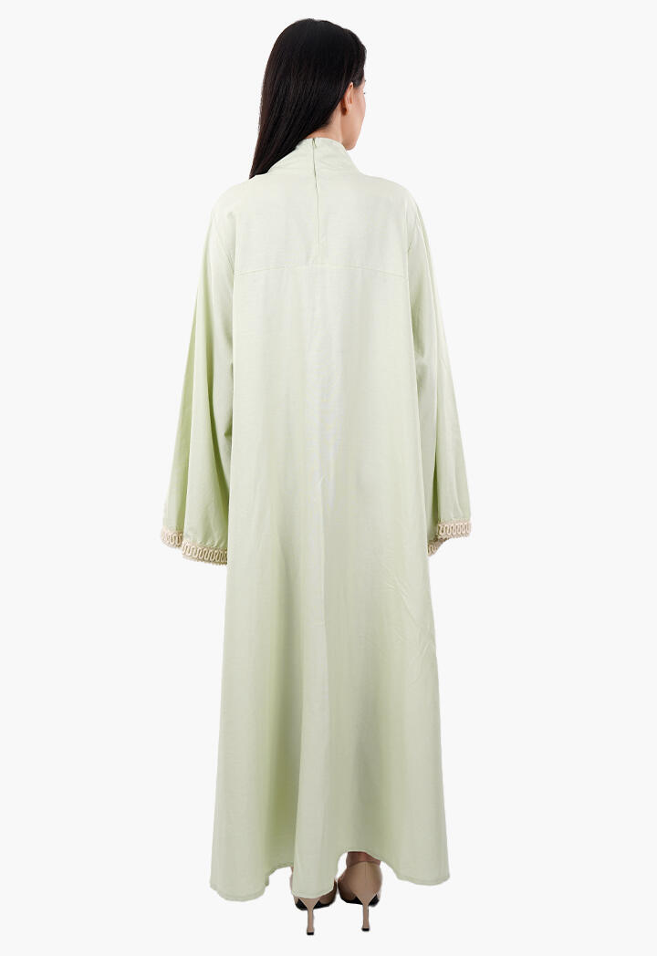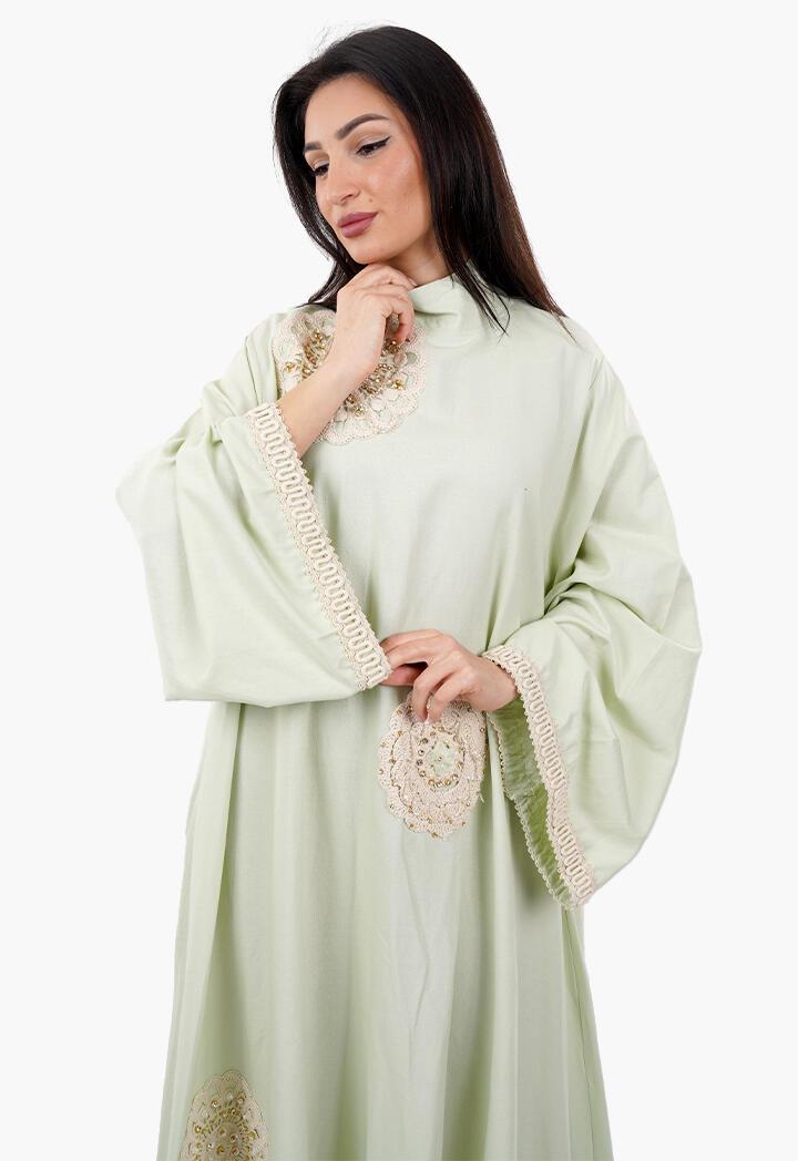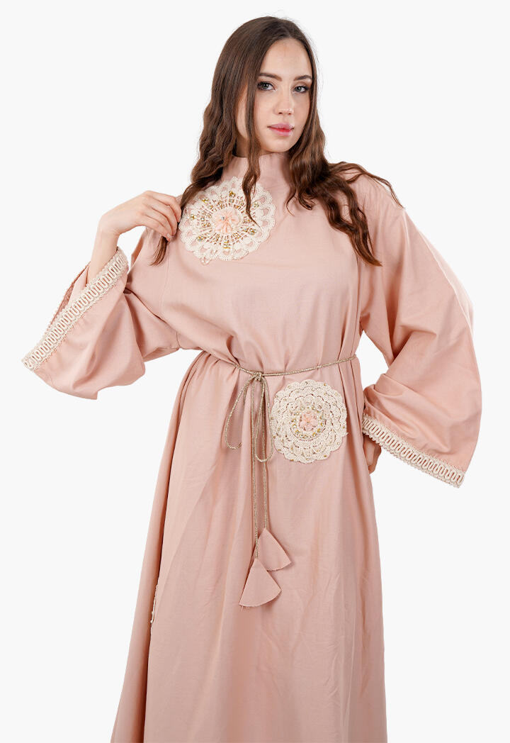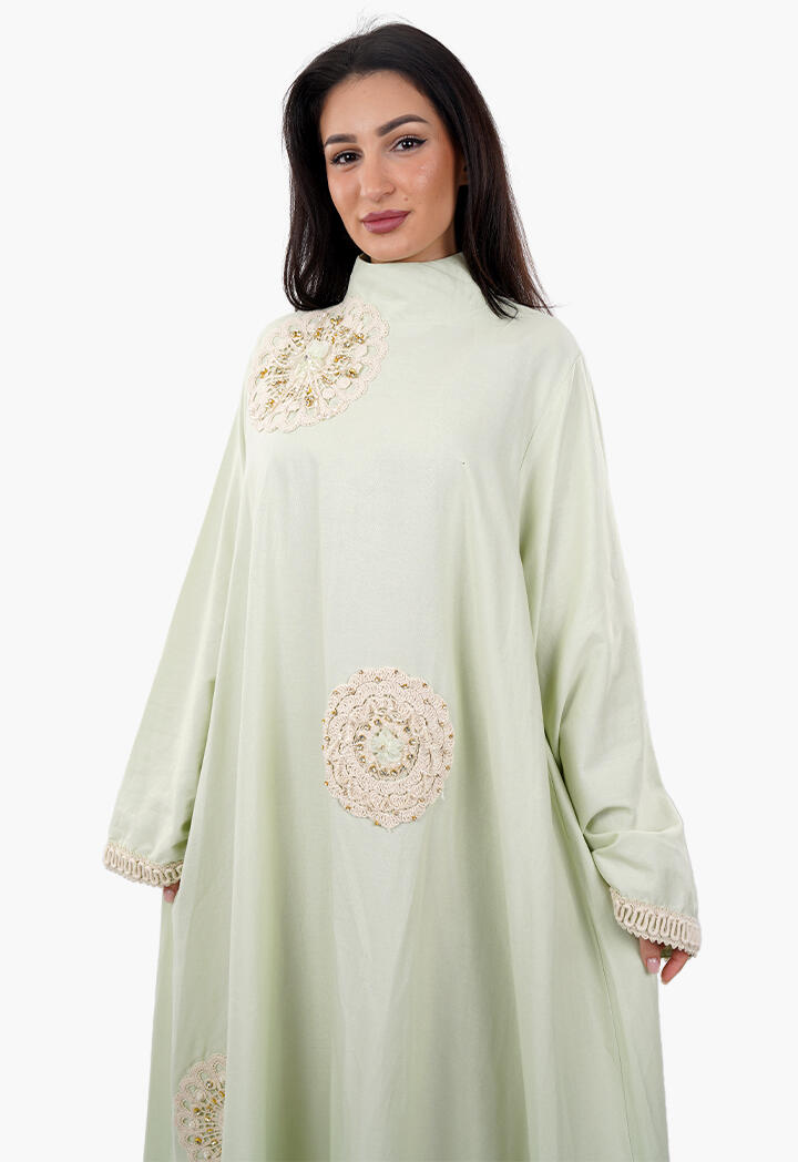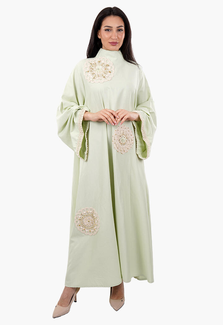 بيرتي فاشون نافذتك لأحدث صيحات الموضة | فستان طويل فضفاض مطرّز بأشكال ورود مع ياقة عالية